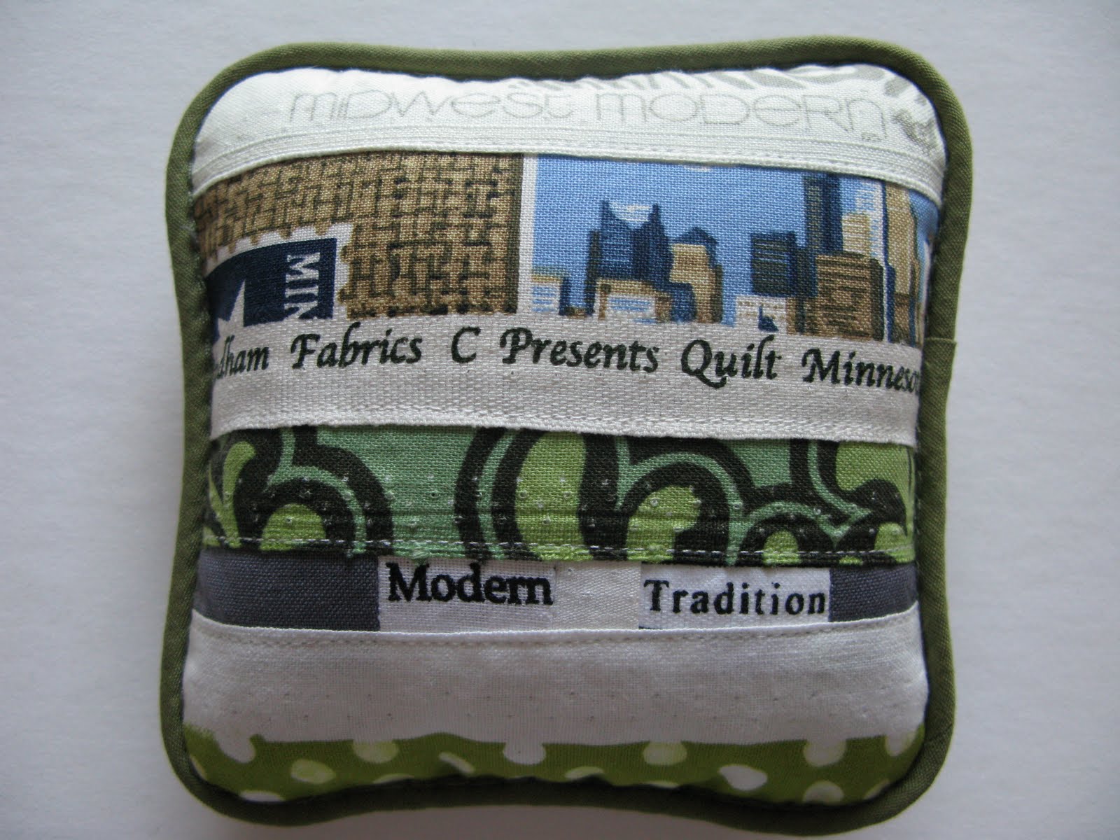 And Jacquie from Tallgrass Prairie Studio has been a complete inspiration. Remember the quilt she made from selvages? I think she used most of her selvages up, so while I didn't get a package from her, I have gotten a lot of inspiration. She is from Kansas and loves modern quilting. So...don't you think she should have a pincushion with selvages that say Midwest Modern and Kansas Song? I thought so too.