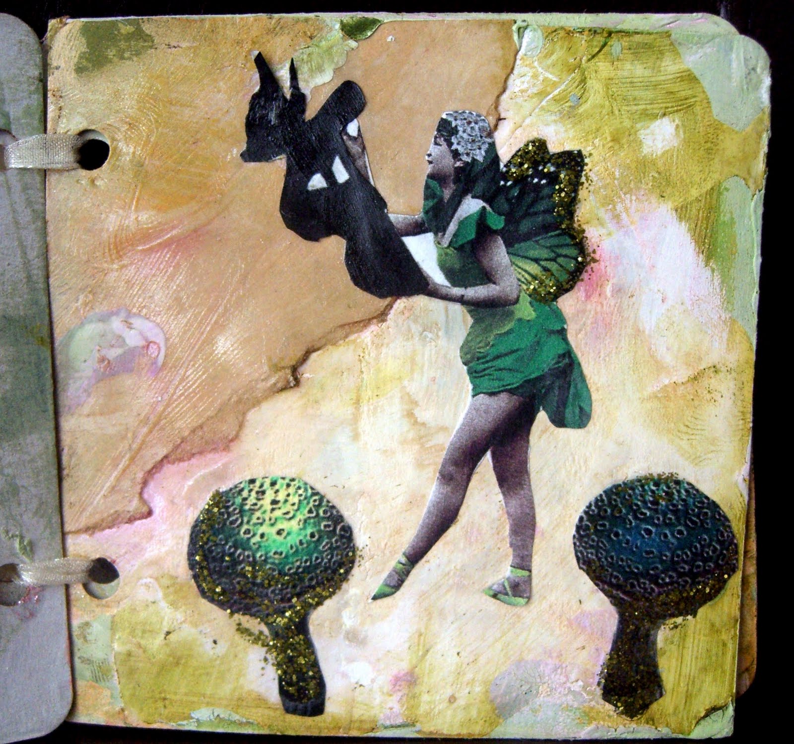 I saved some cardboard (boxes that diet coke comes in---oh how i love diet coke) I cut the boxes in squares, then put them in a drawer and left them (for quite some time) Then I finally got them and and now I have thin chipboard. Next I created a little book, using paints and inks and more paints and inks.